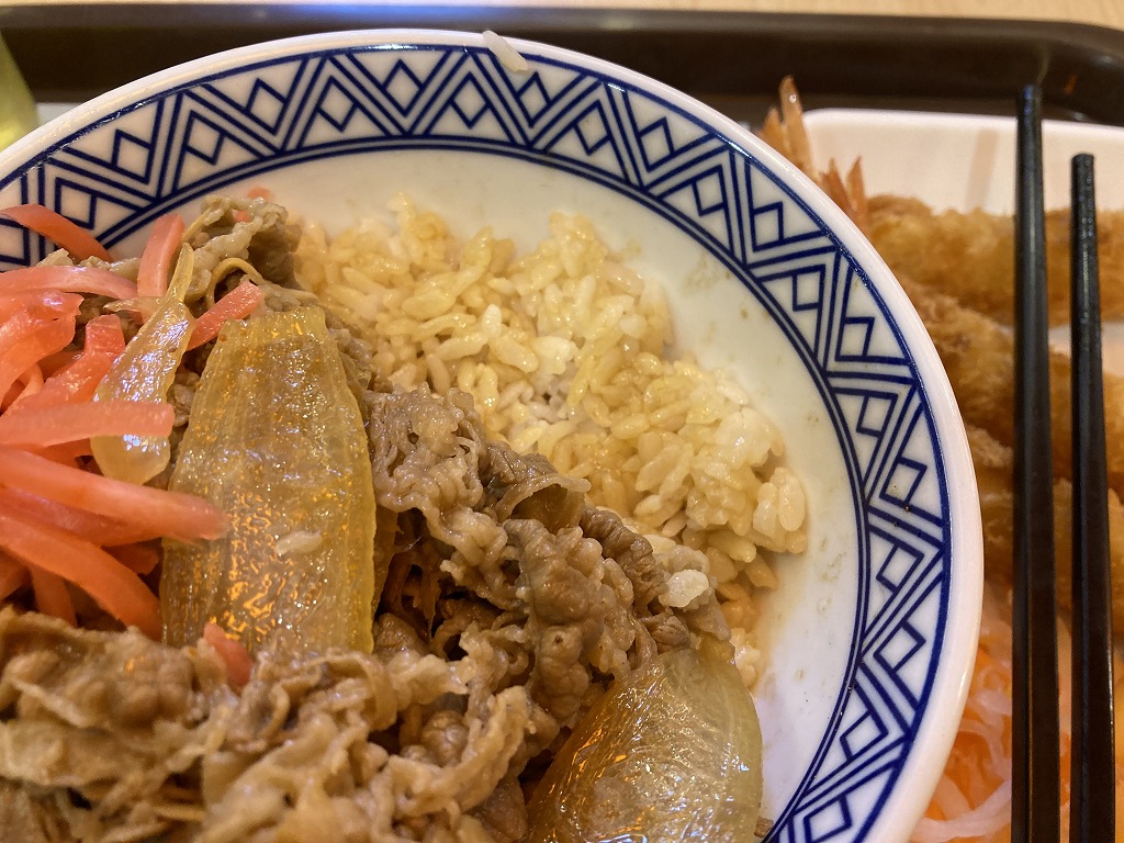 空港で食べた牛丼に汁気が無く、ご飯が白色だったので牛肉をめくって、チェックしてみた。